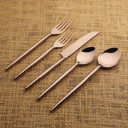 The Brio PVD flatware set captivates with its modern minimalist design and luxurious metallic hues. Slim elegant handles narrow at the ends lending an eye-pleasing silhouette with perfectly balanced weight for comfortable dining. Crafted from stainless steel and finished in a PVD coating, this set is a magnificent blend of durability and luxury, making every meal feel like a special occasion.
