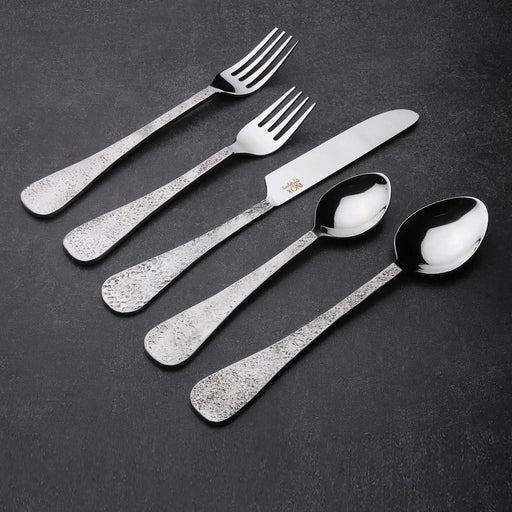 Our Cosage Flatware blends rustic style with cosmopolitan charm. The design showcases mirror-polished utensils with flat hammered teardrop-shaped h...