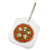 Una pala para pizza es una herramienta que se utiliza para deslizar hogazas de pan, pizzas, pasteles y otros productos horneados dentro y fuera del horno o dentro y fuera de la parrilla. Diseñado con una superficie plana de trabajo/transporte de metal (como una hoja de espátula grande) para sostener el producto horneado y un mango de madera que se extiende desde un lado de esa superficie.