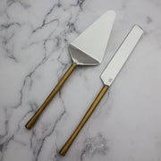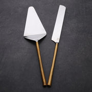 Our Camellia Cake Serving 2 Pc. Set features a highly polished stainless steel knife and serving ladle with vintage gold handles. The signature organic handles of the Camellia flatware design and the warm gold finish give this cake serving set a laidback rustic charm.