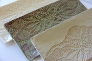 These stunning handmade platters will add that special touch to your dinner table! Each platter is hand-pressed with lace to create an intricate and unique pattern.